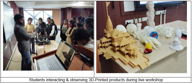 The workshop aimed to enhance students’ technical knowledge while exposing them to emerging innovations in 3D printing. It provided participants with an opportunity to explore cutting-edge techniques and understand how creative ideas can be transformed into physical prototypes using advanced printing technologies.