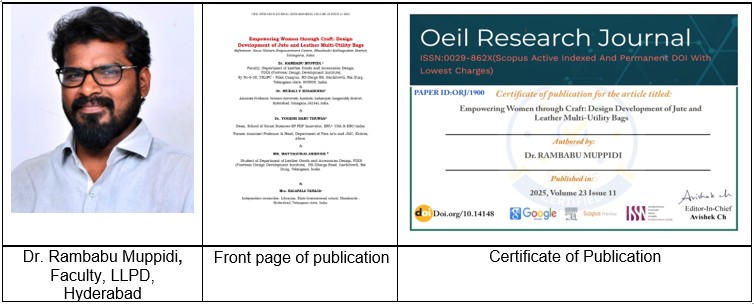 A joint research study led by Dr. Rambabu Muppidi, Faculty at the School of Leather Lifestyle and Product Design (LLPD), FDDI Hyderabad, has been published in the SCOPUS-indexed OEIL Research Journal (ISSN: 0029-862X), a journal recognized in the Arts and Humanities: Visual Arts and Performing Arts category.