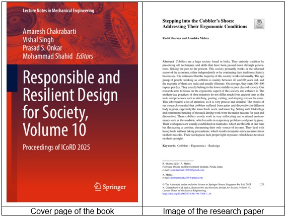 A research paper titled “Stepping into the Cobbler’s Shoes: Addressing Their Ergonomic Conditions” authored by Ms. Anushka Mehra, students of Leather Lifestyle and Product Design (LLPD) and co-authored by Ms. Rashi Sharma, student of Fashion Design (FD) both from Noida campus has been published by Springer Publications in the book Responsible and Resilient Design for Society, Volume 10. This accomplishment marks an important academic contribution in the field of human-centric and socially responsive design.