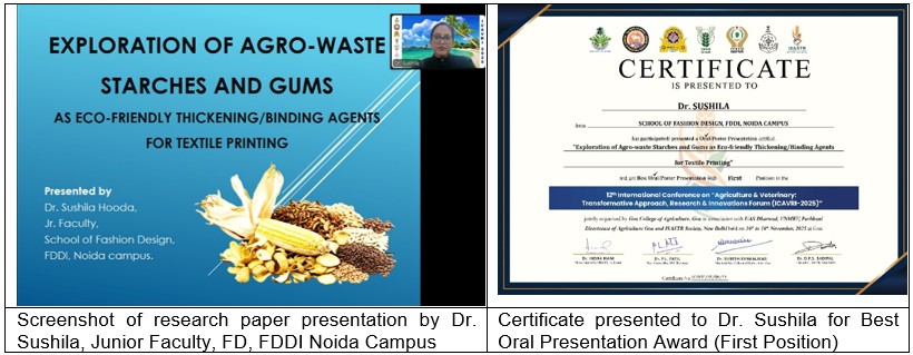 Dr. Sushila, Junior Faculty, School of Fashion Design (FD), FDDI Noida Campus, participated in the 12th International Conference on “Agriculture & Veterinary: Transformative Approach, Research & Innovations Forum (ICAVRI-2025)”, held from 16th to 18th November 2025. The conference was jointly organized by Goa College of Agriculture, UAS Dharwad, VNMKV Parbhani, Directorate of Agriculture, Goa, and ISASTR Society, New Delhi.