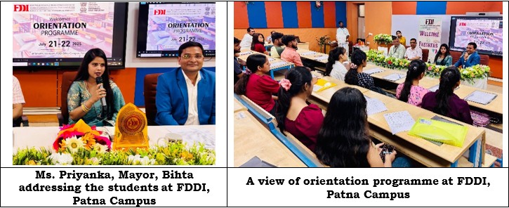 During the orientation programme held at FDDI, Patna Campus from 21st to 22nd July 2025, Ms. Priyanka, Mayor, Bihta who was the Chief Guest of the programme addressed the students and motivated them to acquire learning with dedication, staying curious, and continuously upgrade one’s skills to succeed in their chosen fields.