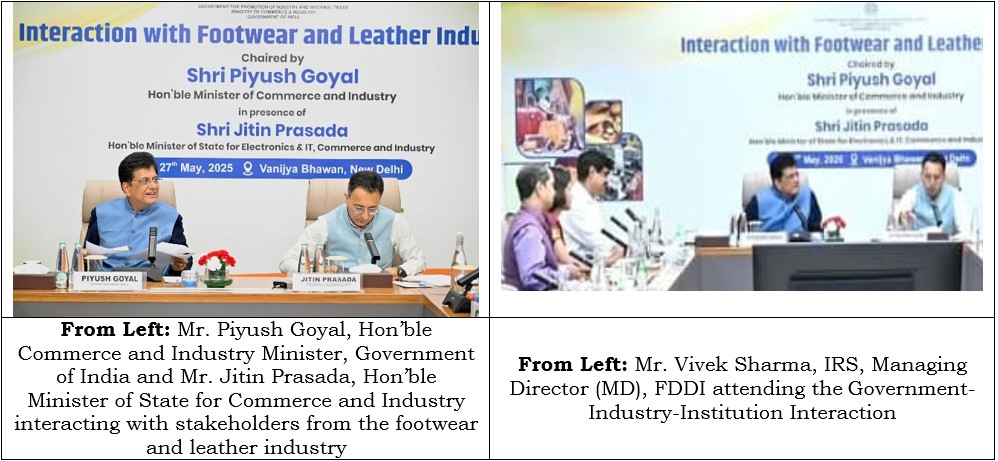 On 27th May 2025, Mr. Piyush Goyal, Hon’ble Minister of Commerce and Industry, Government of India, along with Mr. Jitin Prasada, Hon’ble Minister of State for Commerce and Industry, held an important interaction with key stakeholders from the footwear and leather industry.