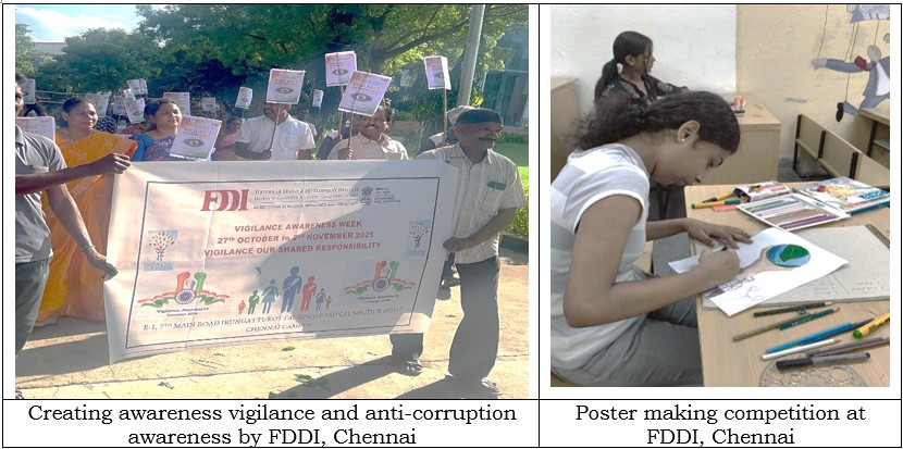 At the FDDI Chennai Campus, a series of creative and awareness-driven activities—including slogan writing, poster making, rangoli, and essay writing competitions, along with outreach programs on vigilance and anti-corruption awareness—were conducted throughout the week. Through these initiatives, participants expressed their creativity and understanding of the theme, reinforcing their commitment to honesty and ethical practices in every sphere of life. The observance concluded with a renewed pledge to uphold the principles of transparency, accountability, and good governance.