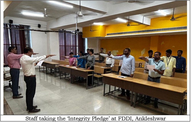 At the FDDI Ankleshwar Campus, faculty, staff, and students took the Vigilance Pledge both physically and digitally, reaffirming their commitment to uphold integrity, transparency, and accountability in all aspects of life.