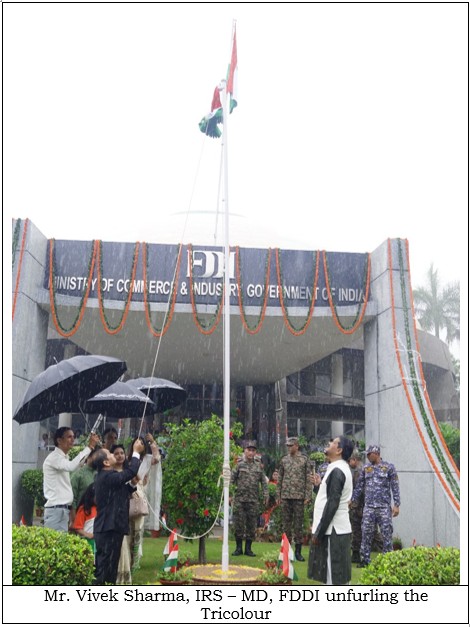 The 79th Independence Day was celebrated with great fervour, patriotism, and traditional gaiety across all campuses of FDDI on 15th August 2025. At the FDDI Head Office in Noida, Mr. Vivek Sharma, IRS – Managing Director (MD), FDDI, unfurled the Tricolour in the presence of Colonel Pankaj Kumar Sinha, Secretary, FDDI, Ms. Manju Maan, Executive Director – Noida Campus, along with staff members, their families, and students.